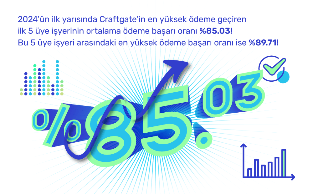Öyle ki, 2024’ün ilk altı ayında Craftgate’in en yüksek ödeme geçiren ilk 5 üye işyerinin ortalama ödeme başarı oranı %85.03 idi. Bu 5 üye işyeri arasındaki en yüksek ödeme başarı oranı ise %89.71 olmuştu.