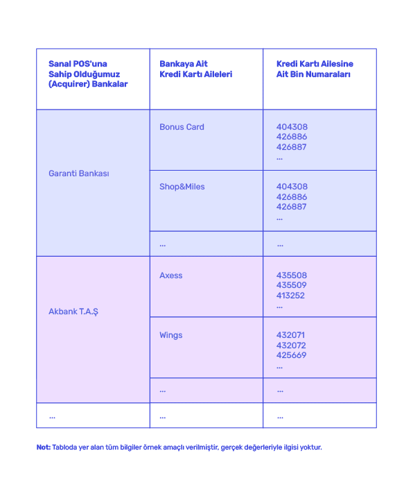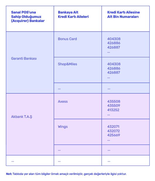Kredi kartı ailelerine ait BIN numarası blokları bulunur. Kredi kartının ilk 6 veya 8 hanesine BIN/IIN Numarası adı verilir. Ödeme isteği geldiği anda sunucu tarafındaki yazılım, alıcının kredi kartının BIN numarasına göre kredi kartı ailesini, kartın bankasını, kartın tipini, kartın bireysel mi ticari mi olduğunu ve kartı düzenleyen bankayı tespit edip, bu bankaya ait tanımlı sanal POS üzerinden ödeme gerçekleştirir.